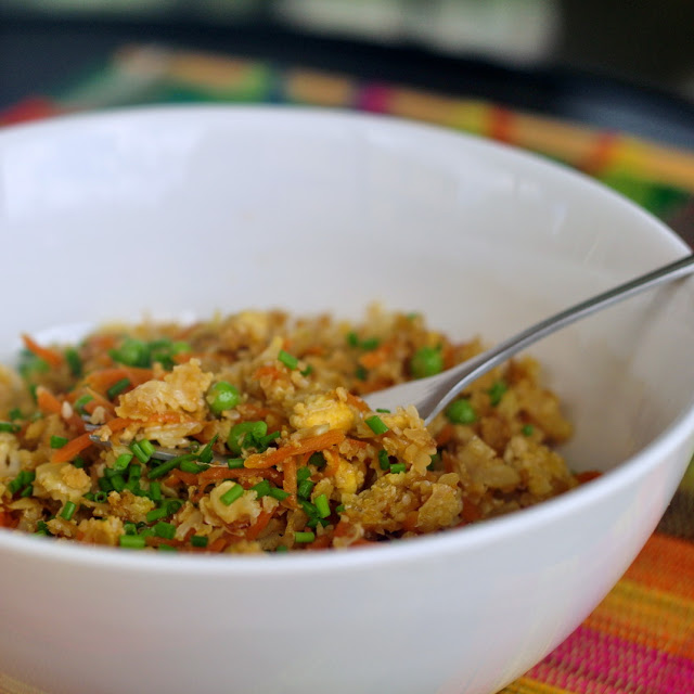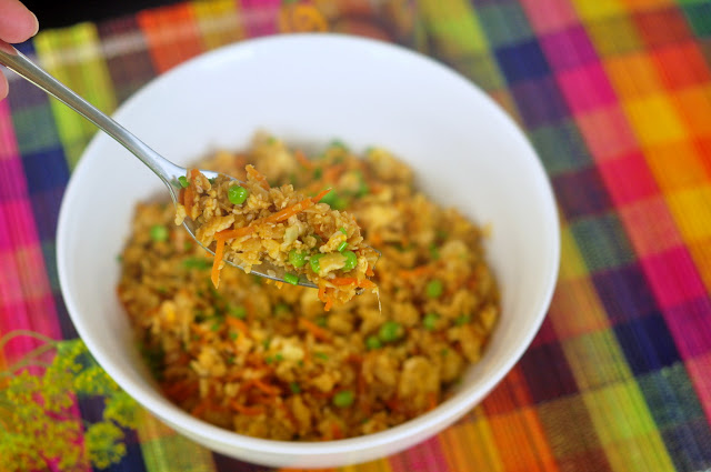 Ryžių pakaitalui kalafioras tiesiog susmulkinamas ir apkepas keptuvėje su šlakeliu aliejaus. Aš patiekalą šiek tiek paturbinau ir rezultate valgiau labai skanų vegetarišką pagrindinį patiekalą su kinietiškais akcentais.